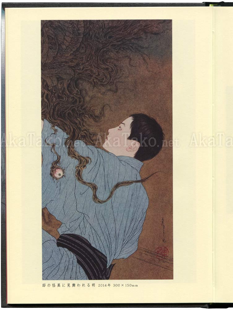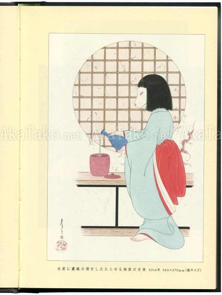 Special, limited edition of Takato Yamamoto's collection of artwork is styled after the highly collectable "Kyoka-bon" books of first edition Kyoka Izumi novels. Limited to 500 pieces, special edition includes a purple slipcover, melon colored page edges, incense, one postcard, and six ribbon bookmarks attached at the binding. Actual book is a two part book - a Japanese text novel by Kyoka Izumi which is illustrated with 29 black and white works (underdrawings) by Takato Yamamoto plus 28 full color images of new paintings. Selected originals available by inquiry.