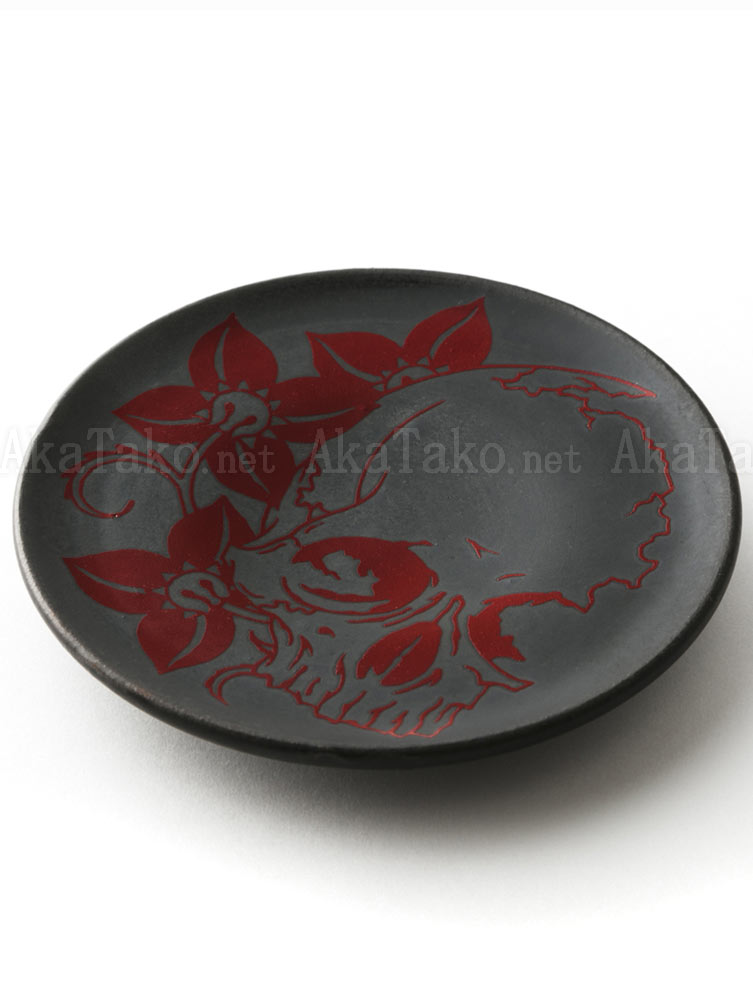 One snack sized plate of black ceramic with red design of a skull and flowers. Plates were made by one of three local kilns in Japan as part of the CREATION Project 2018.