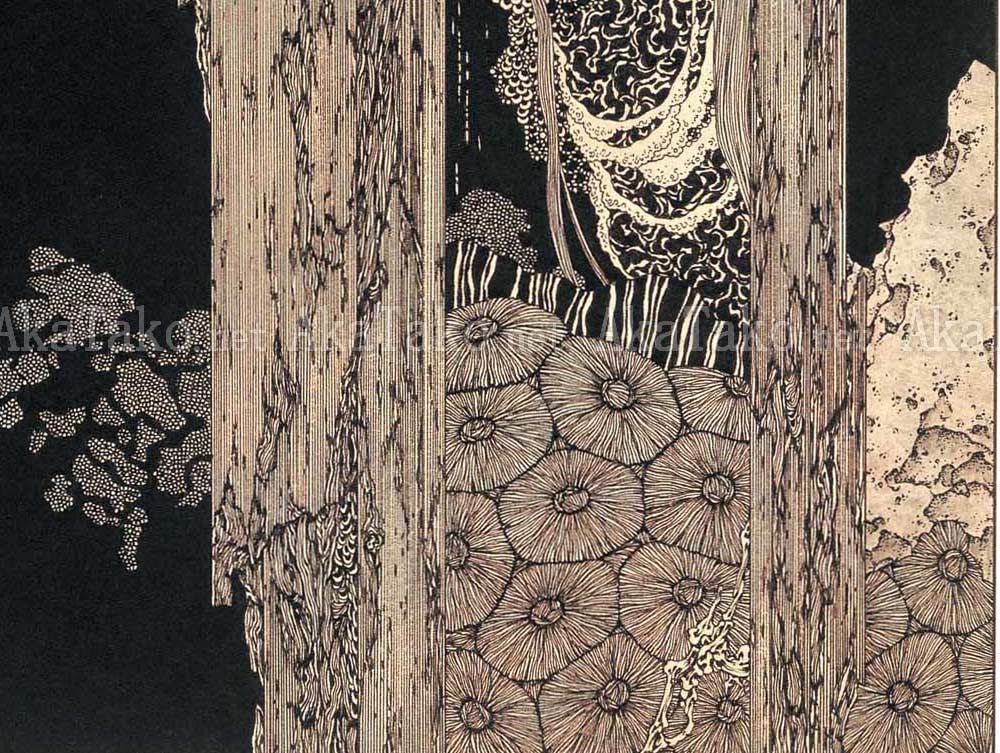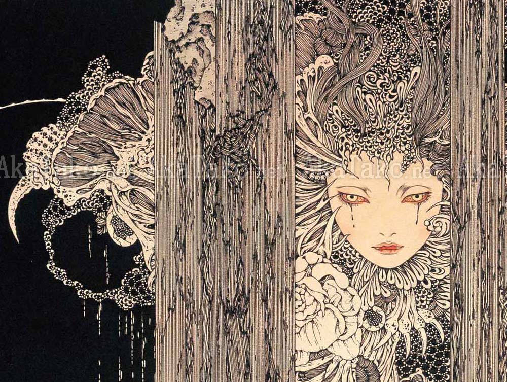 Original painting by Takato Yamamoto "Vampire - Metamorphosis II". Originally printed in the "Rib of a Hermaphrodite" book. A figure peers out from behind two wooden pillars. Tears drip from its eyes and its mouth is stained with blood. Exposed sinew, claws, and bones compose the body along with one white rose.
