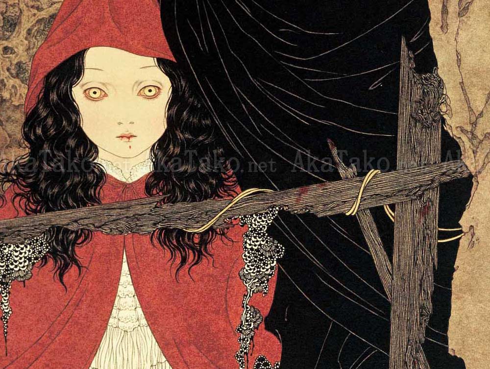 Original painting by Takato Yamamoto "Vampire - Temptation". Originally printed in the "Rib of a Hermaphrodite" book. A girl with long black hair wears a red hooded cape over a delicately ruffled white dress. Her eyes are wide open and blood drips from her mouth. A man in a black cloak and hat stands on the right with a slight smile on his face. Part of a blood spattered body can be seen in the foreground.