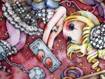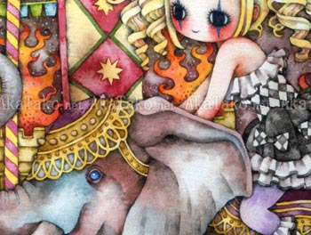 Mini poster print with the artwork "Insanity Show - Trainer" by Tama. The craziest circus in town features cute blonde girls in black and white outfits. An elephant learns to balance on top of one of the girls in the center ring while the trainer rides it like a pony.