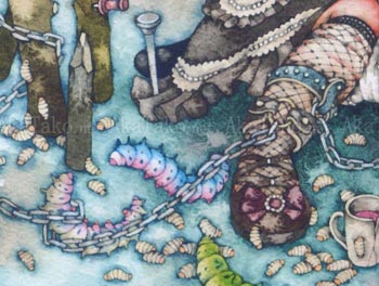 Mini poster print with the artwork "Lager" by Tama. A girl with dark wavy hair sits on the floor. She wears colorful butterfly wings and many caterpillars crawl around her. She has a frilly brown dress on with white lace trim, fishnet tights, and ankle chains that keep her where she is.