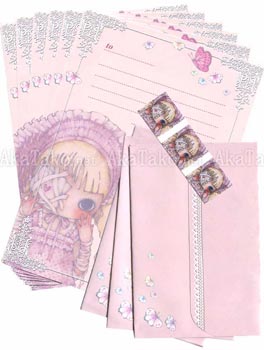 Stationery set featuring "Longing Energy" by Tama. A sweet girl is dressed all in pink with bandages on her arms and a big eyepatch with a heart in the center.