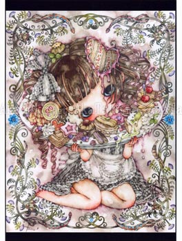 Mini poster print with the artwork "Lidocaine Drop" by Tama. A brown curly haired girl kneels on the floor. She is holding a platter under her head that is filled with sweets. A piece of cake has been cut out and frosting drips down her face.