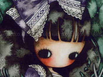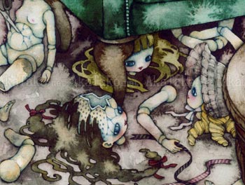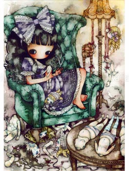 Mini poster print with the artwork "Miss Pro Defunctis" by Tama. A girl with long dark hair is wearing a purple dress with white lace and sits in an overstuffed green chair. Pieces of dolls are strewn around the room - separated from their heads. The girl holds a pair of scissors in one hand and the body of a doll in another.