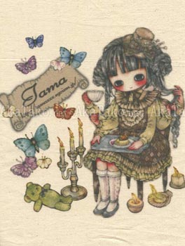 A sweet little reusable eco-bag from Tama features "Monologue". It's always a good time for a tea party when you have three pairs of arms! Or maybe this little lovely could user her arms to help carry all your purchases for you.