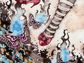 Mini poster print with the artwork "Papillon" by Tama. A girl with dark curly hair wears black and white striped socks, red heels with bows, a frilly black dress, and an animal skin over her shoulders. Butterflies are caught mid-flight by bright blue flame.
