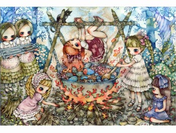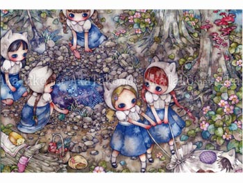 Set of four postcards with the cute and dark artwork of Tama. Features four images: Lunch is Ready, Ritual, Live and Let Live, and Here I Am.