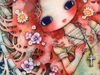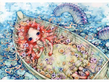 Mini poster print with the artwork "Rosary" by Tama. A girl in a green dress with very long auburn hair is laying down inside a small boat. One of her ankles is chained to the inside of the boat. There are many flowers scattered inside the boat. The water is blue with big lily pads and a large sea serpent's body appears out of the water.