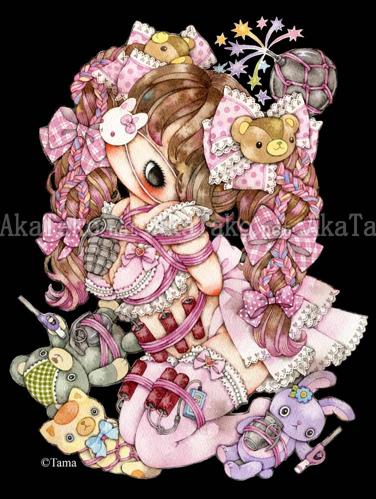 Brand new t-shirt featuring Tama's painting "Masochistic Pink" which is published in her upcoming book "Deep Memories". A cute girl wearing pink ruffles and lace has a bunny eyepatch and bear faces with pink bows in her pigtails. She's tied up in pink cords with dynamite, a grenade, and a bomb. Her three stuffed animals join in on the fun.