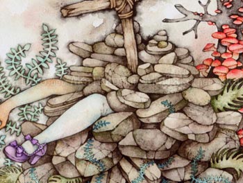 Mini poster print with the artwork "Under the Rose" by Tama. A girl with big brown curly hair wears a black and white ruffled dress. She's kneeling in front of a pile of stones with a wooden cross in the top and arms and legs sticking out of the stones. A few types of mushrooms and ferns sprout out of the ground.
