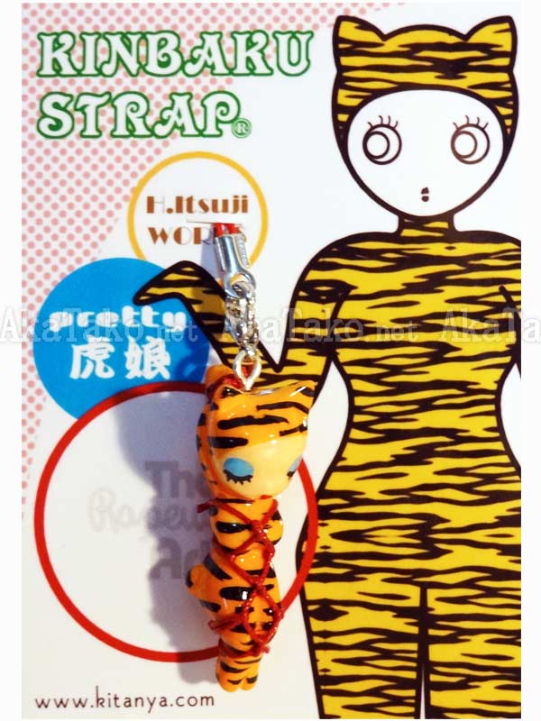 A pretty lady in a tiger costume is tied up in Japanese rope bondage with her hands behind her head. Kinbaku cell phone strap handmade in Japan and signed by the artist (in red on back). Comes on a paper display card as shown in second photo and has a lobster claw clasp to make attachment easier.