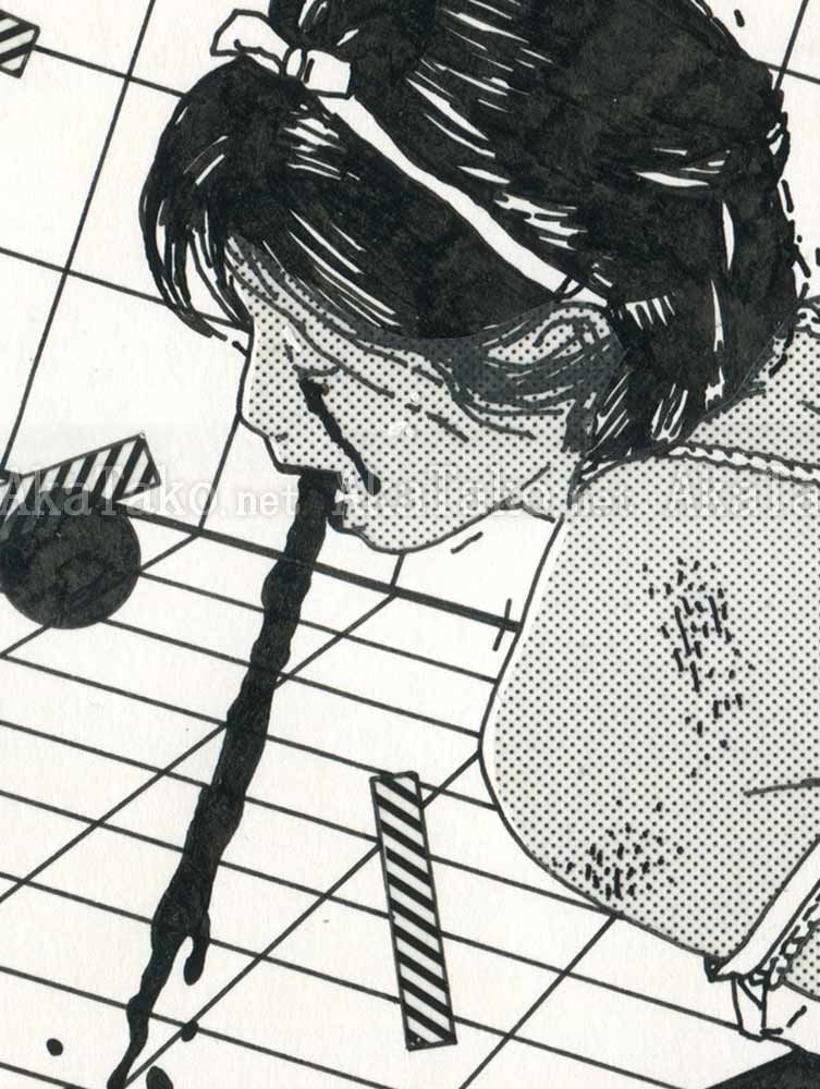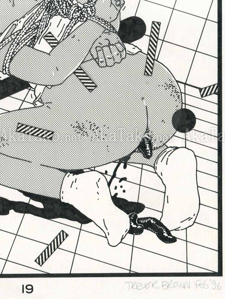An original black and white from Trevor Brown is a girl with black hair wearing white socks and a white tank top. Her arms are tied behind her back with rope. She crouches in a tiled room as she vomits, cries, urinates, and defecates. From the series "Soil and Water". Unpublished as far as I can find.