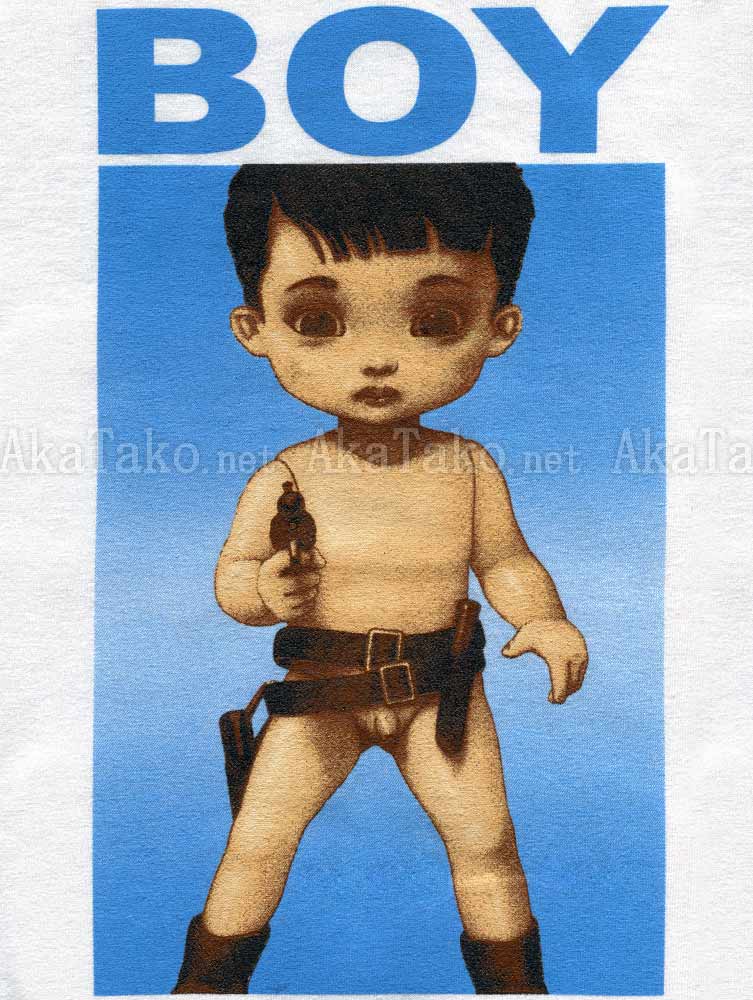 The iconic "BOY" t-shirt featured on the Venetian Snares "Horse and Goat" album is a reality! Originally printed in the "Forbidden Fruit" book, this wide-eyed nude boy is ready to shoot you with his pistol without a second thought.