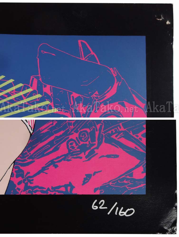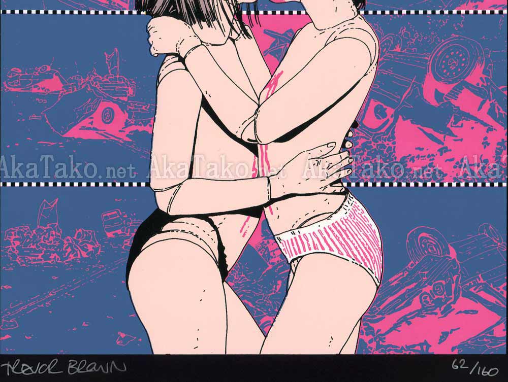 Two ball-jointed girls wearing panties share a bloody kiss in front of a grid of pink and blue car crashes. Print is silk-screen on very heavy weight paper and was produced in 2007. Number 62/160.