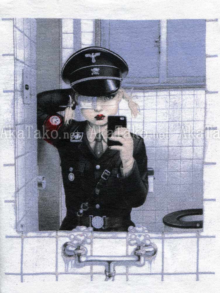 This cute blonde girl dressed in a sharp black uniform takes time out to snap a selfie in the bathroom mirror. Originally printed in the "Girls War" book.