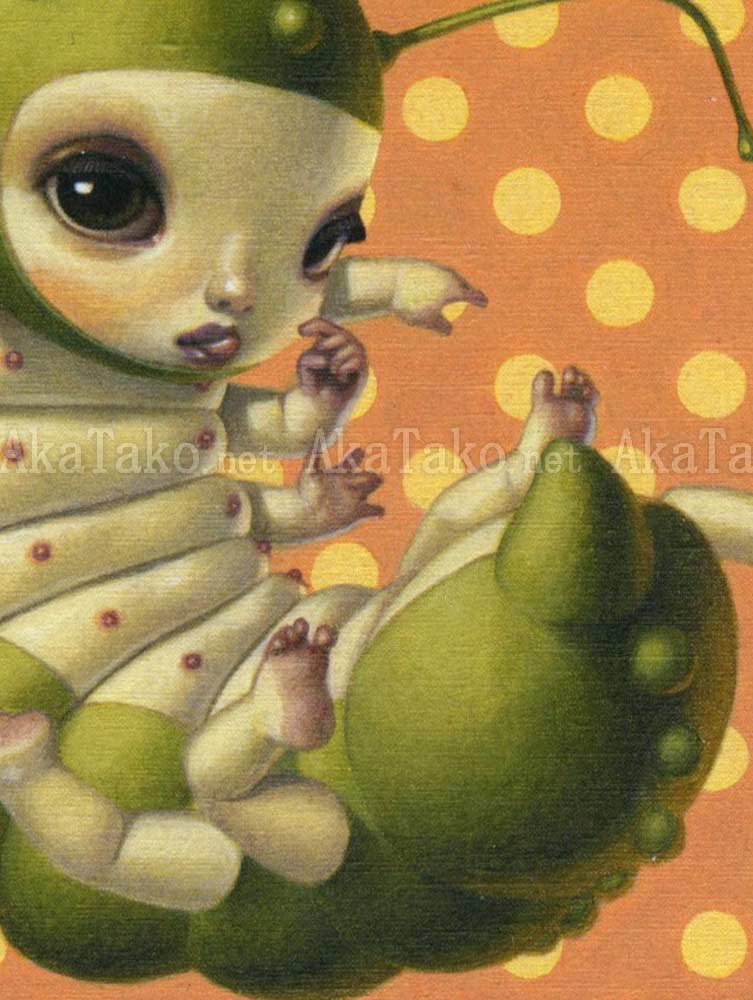Original painting "Lora Larva" is part of the "Toy Box" series by Trevor Brown. The postcard version contains this rhyme: "lasciviously licking lips / li'l lora larva /lethal lewd lusty looks / la-la-la-la-lah".
