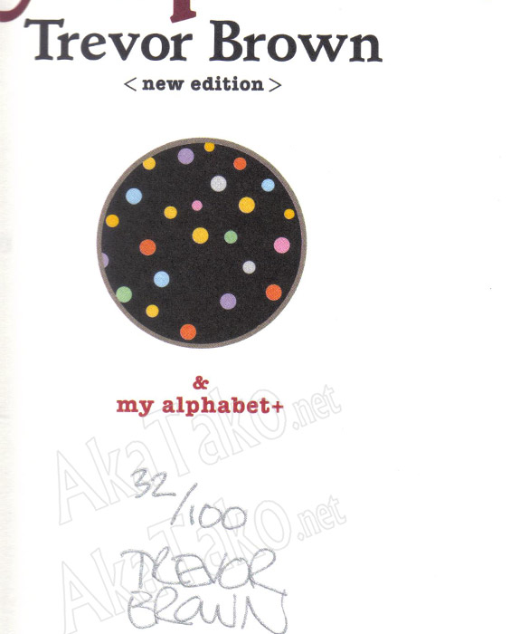 Newer edition of "My Alphabet" by Trevor Brown. The cover is a fluffy light blue terry cloth. Just like the previous editions, this one is made to look like a children's book - each page has a letter of the alphabet and an illustration of a word with that letter. "A" for amputee, "B" for bait, etc. Comes in a cardboard "dust jacket" with circles cut out of it to show only part of the cover.