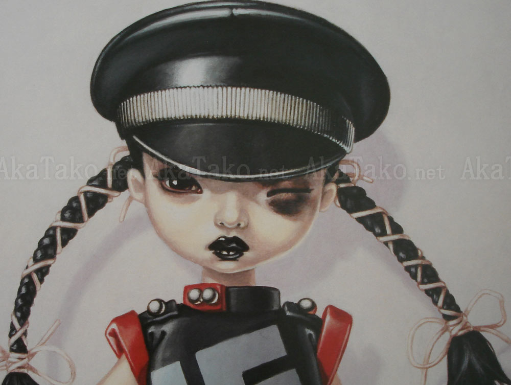 This poster features Li'l Miss Sticky Kiss in "Nazis are Sexy" - dressed up in a black bondage outfit with a scary looking demon dog. And a rather scary looking leash too! Poster was a limited edition of 150 pieces but is not numbered.