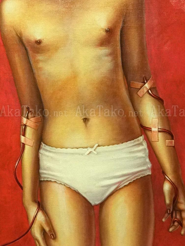 Original painting "Pink Transfusion" was first published in Trevor Brown's Medical Fun book. An Asian girl in white panties stands in front of a dark pink wall. She eyes a hanging IV bag full of blood which curls up and into her left arm. A second tube comes out of her right arm and disappears off the edge of the canvas.