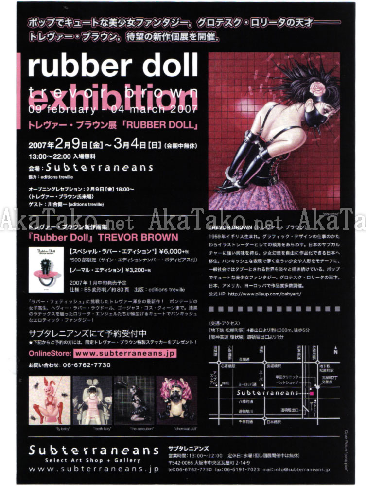 Promotional flyer for Trevor Brown's Rubber Doll exhibition at Subterraneans February 9 - March 4 2007. Features the painting "Penis Pixie".