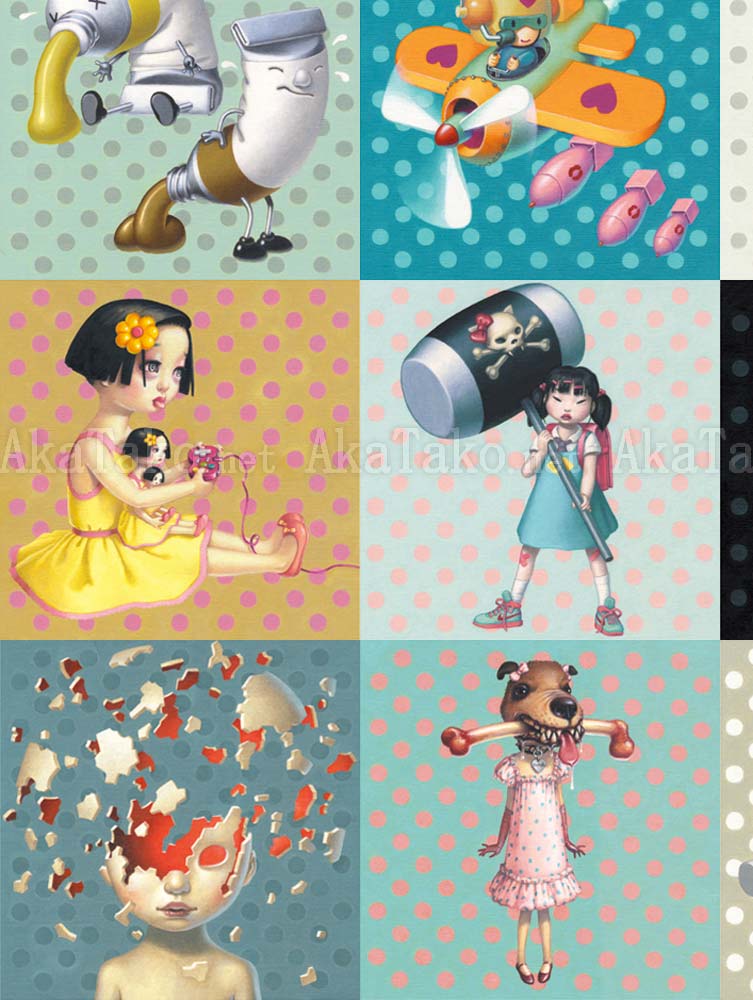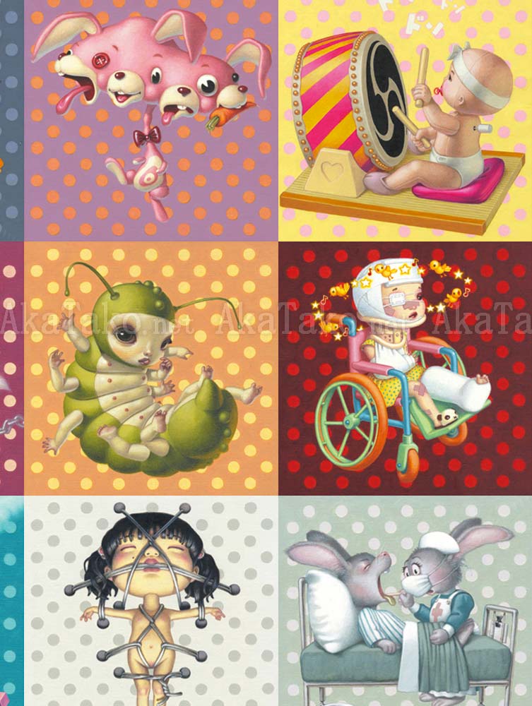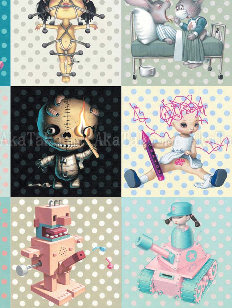 Twenty new paintings by Trevor Brown, tiled together into a sweet and scary poster. Painting titles (from left to right) are: Iris, Goldfish, Radioactive Rabbit, Taiko, Brains, Monsters, Lora Larva, Broken Doll, Snot n Shit, Love Bombs, Polkadot Bondage, Nurse Bunny, Zelda, Lemon Kitten, Undead, Scribblehead, The Boy Whose Head Exploded, Butch, Mister Square, and Tank Girl.