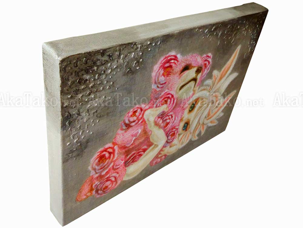 Yoko Mill's original painting inspired by "Utamakura" ukiyo-e shunga artwork by Kitagawa Utamaro. A fuzzy bear with both pink fur and pink flowers blooming on his body embraces a white-haired girl with multiple long animal ears sprouting from her head. Background is a textured silver acrylic.
