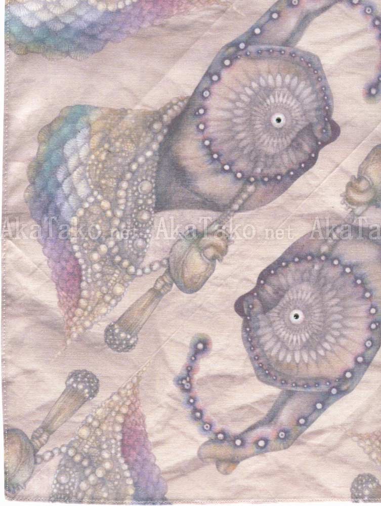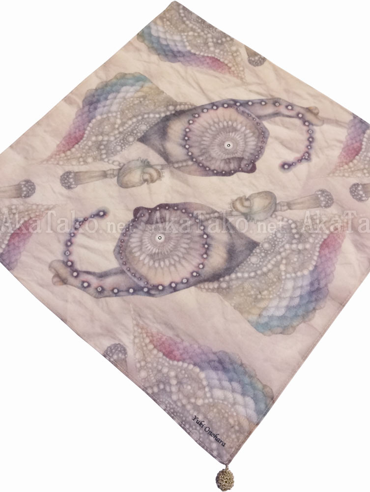 An original handkerchief designed by Yuki Onohara depicts human hands in the shape of a "6" - an image housed in the library of the Trinity Lavra of St. Sergius monastery. Beautifully packaged with one woven gold ball on a corner and a sparkling crystal in the "eye" of each hand.
