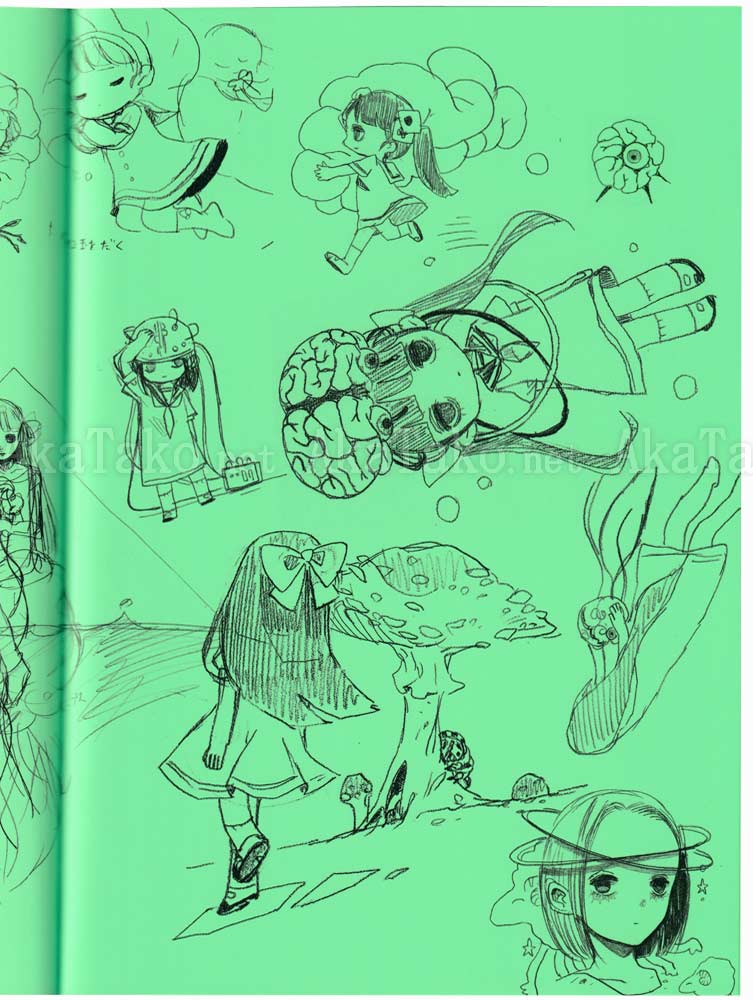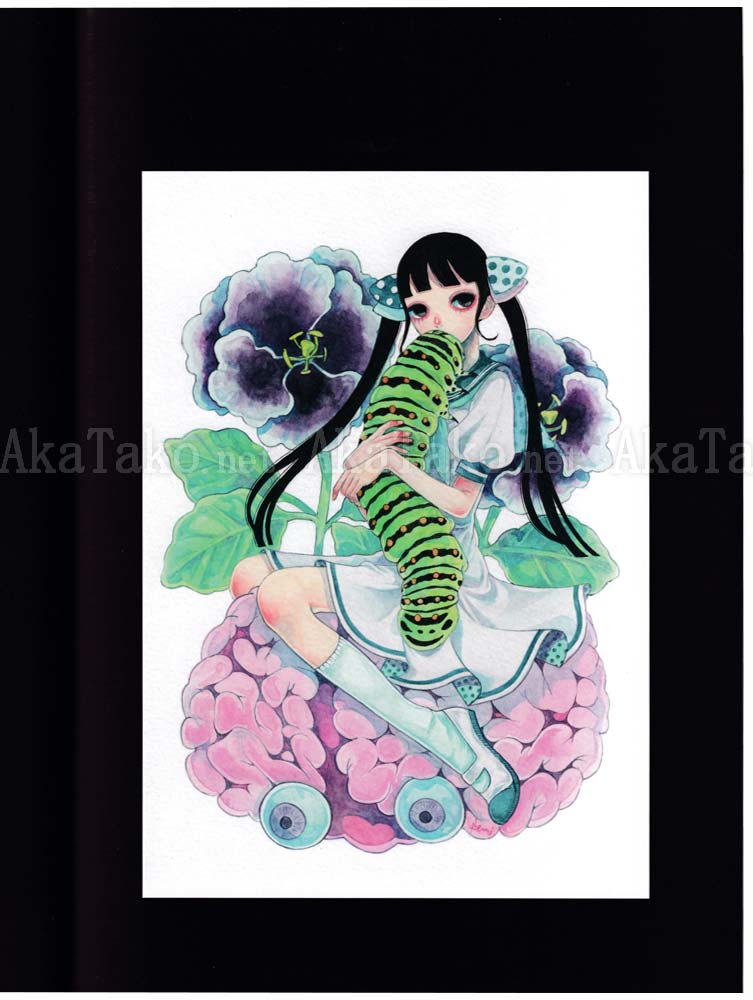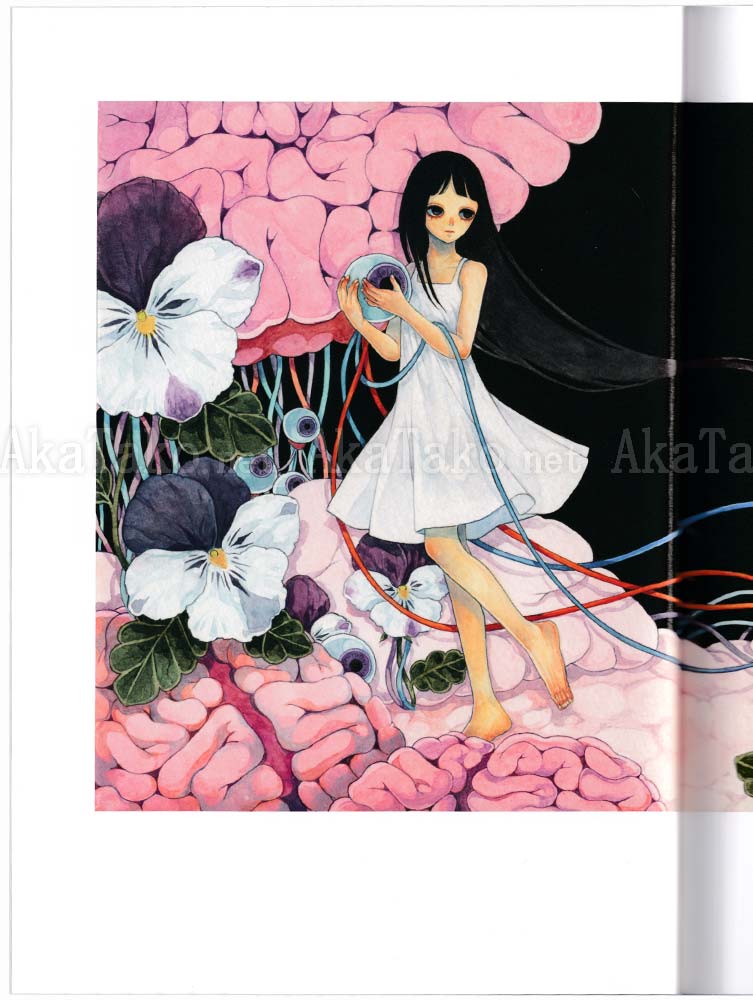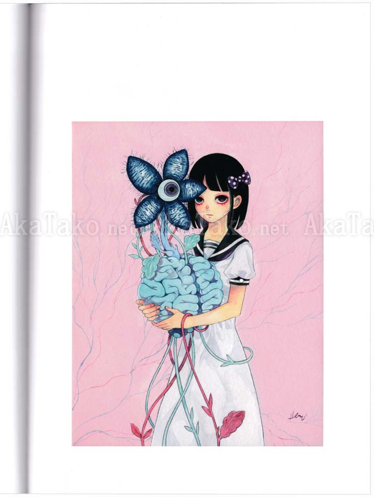 Three emerging Japanese artists created a separate book each with the same title "Wandering to Dream". Em Nishizuka's love for insects, flowers, and girls mixes with literal thoughts in the form of large brains.